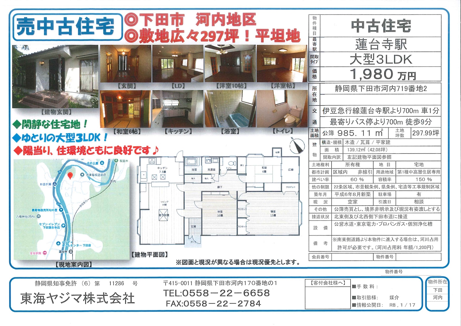 静岡県下田市河内地区の閑静な住宅地に佇む、敷地広々約297坪の平坦地に建つ大型3LDK中古住宅のご紹介です。
