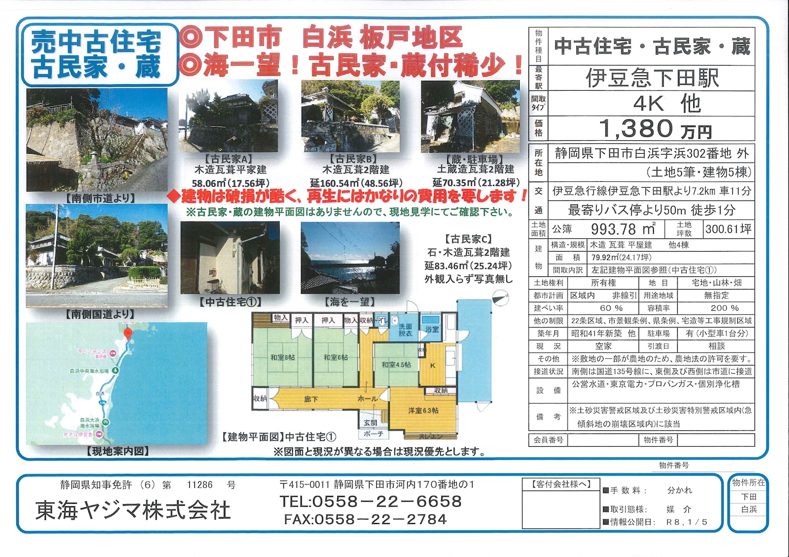 下田市白浜板戸地区に位置する、海を望む立地の古民家・蔵付き中古物件のご紹介です。