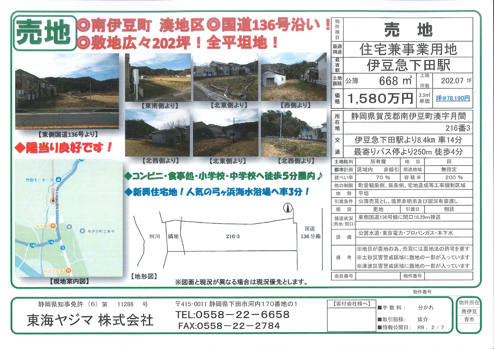 南伊豆町湊地区、国道136号線沿いに位置する、敷地面積約202坪(668㎡)の売地です。