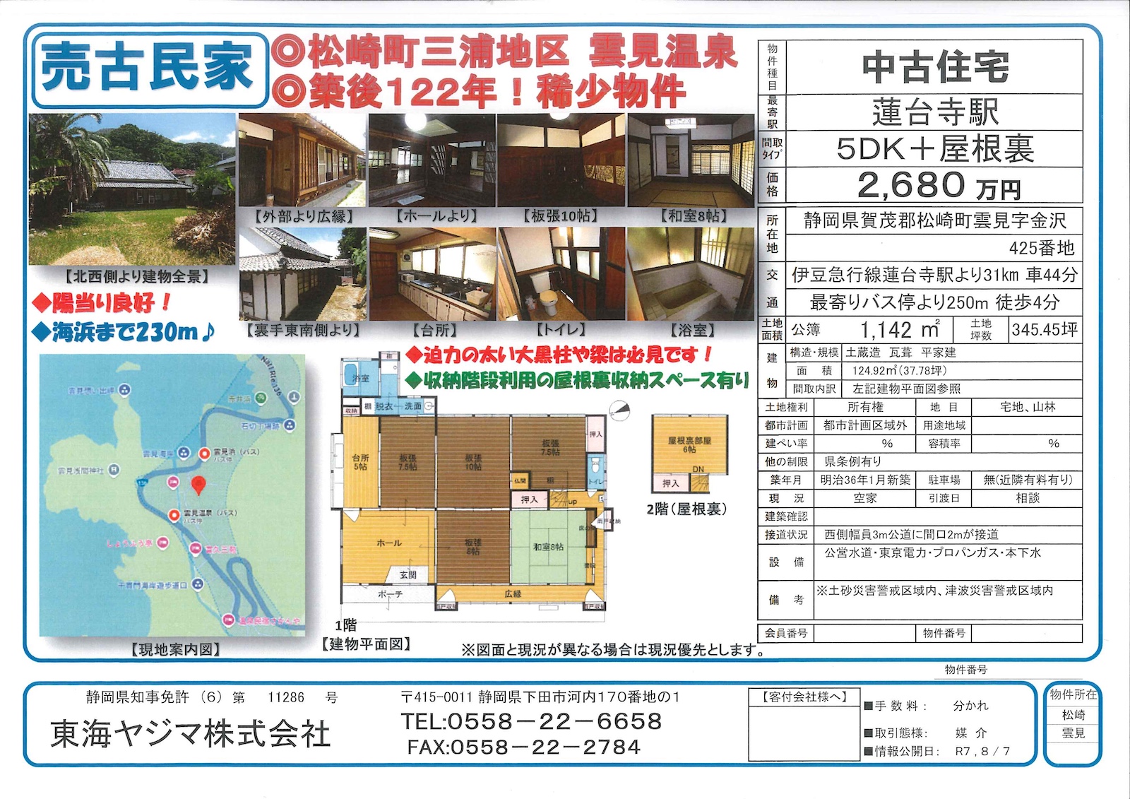 海までわずか230m、陽当たりも良好な立地です。歴史と風情を感じさせる太い大黒柱や梁は必見。収納階段を活用した屋根裏収納スペースも魅力の一つです。