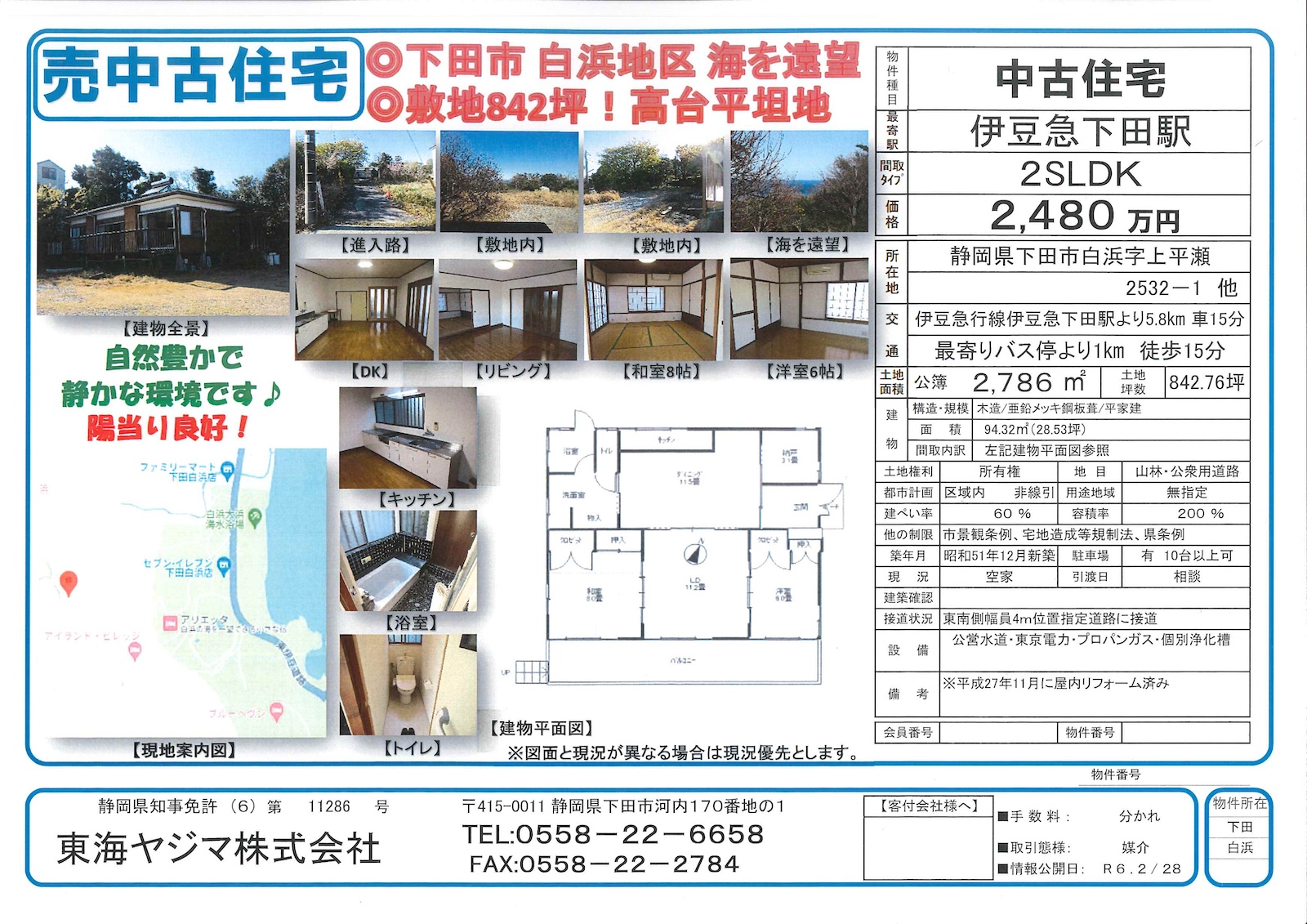 下田市白浜地区の高台に位置する、海を遠望できる中古住宅のご紹介です。